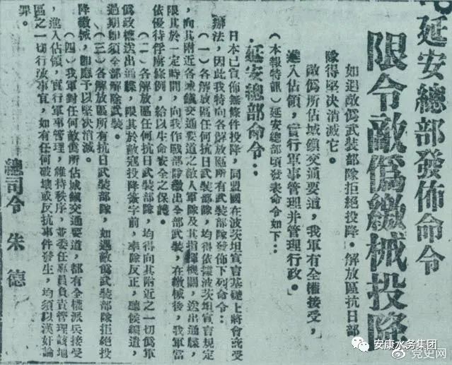 1945年8月10日,朱德发布命令,限令日伪军缴械投降。图为当时的报道。